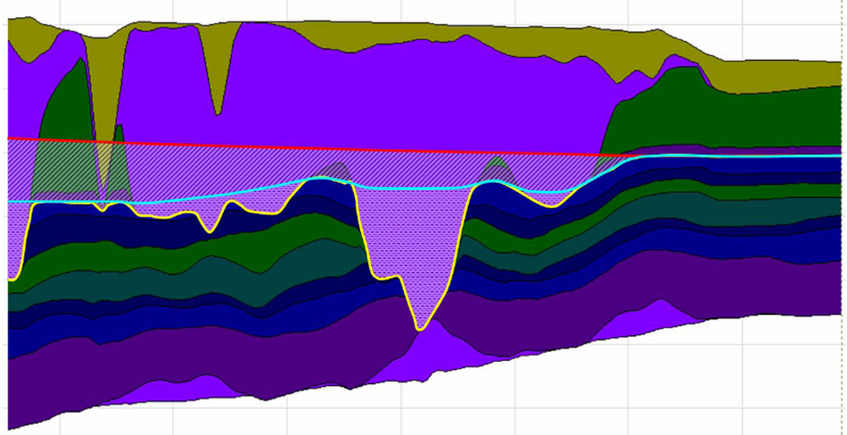 Figure 1. Illustrating the concept of regional (red), local (cyan), and actual (yellow) surfaces. Left hatched area represents autochthonous salt removed and cross hatched area allochthonous salt at the time of this horizon deposition