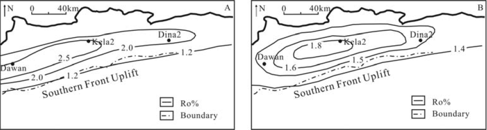 Figure 2. A) Contour of the vitrinite reflectance values (Ro%) of the modern Jurassic bottom based on basin modeling (After Liang et al., 2004). B) Contour of gas maturity (Ro%) based on the kinetic isotopic modeling. The dashed line is the boundary line of the Kuqa depression.