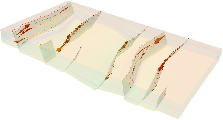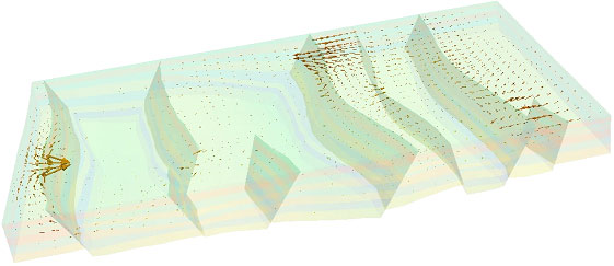 | Figure 1: Synthetic basin, with alternatively shale and sand layers cut by several conductive faults. Arrows correspond to water flow field in the sedimentary layers. | Figure 2: Same synthetic basin as Figure 1. Arrows correspond to the water velocities along the fault surfaces. |
