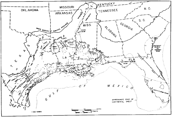 Fig. 15. Diagrammatic map outlining major structural features of the southern Atlantic and northern Gulf Coastal province. 1, Ruston field. 2, Mexia-Talco trend. 3, State-Line trend. (From Murray, 1961.)