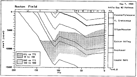 Fig. 17. Burial-history plot of the Ruston field based on the Arkla Gas Company No. 2 Mathews, Sec. 29, T19N, R2W, Lincoln Parish, Louisiana. (Plot was prepared by Renae Wilkinson of Platte River Associates, Denver, Colorado.)