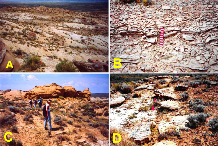 Figure 5.2. Photographs of outcrop area. A. General view. B. HST shale (15 cm scale). C. Sandstone-filled channel within HST shale. D. Sheet sandstone within HST shale.