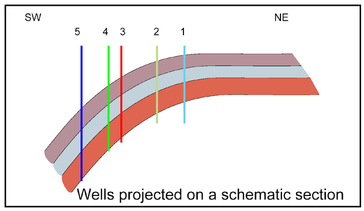 Figure 7.2. Cross-section of structure at Santa Barbara Field, utilizing markers from the wells in Figure 7.1, projected onto this SW-NE schematic section.