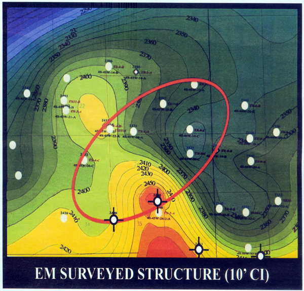 Figure 4. EM-derived structure map from 29 "virtual" logs gathered adjacent to existing wells. The map indicated a prospect lead to be too small to support the cost of drilling and development.