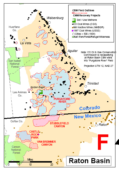 Annual coalbed methane gas volume data through 12/31/2002 were obtained from 14 state oil and gas regulatory entities or geological surveys. Produced CBM gas volumes from each state were classified by basin. The sum of all reported CBM gas volumes per basin through 2002 is shown as the cumulative production pie chart in Figure 7A. CBM production volumes over time for all basins are shown graphically in Figure 7C. The most obvious trends are (1) the dominance of the San Juan Basin since the late 1980s, beginning a decline in 1999; and (2) the rapid increase for the Powder River Basin from the late 1990s. The CBM basins are subdivided into three tiers based on 2002 annual production volumes, shown as graphs in Figure 7D, E, and F. Note the change in vertical scale between the graphs. Tier 1 (>110 BCF/year) includes the San Juan and Powder River Basins plus the Black Warrior (steady at ~115 BCF/year) (Figure 7D). Tier 2 (60-105 BCF/year) is composed of three basins with significant production additions since 1992-1995: Raton, Uinta, and Central Appalachian Basins (Figure 7E). The graph for tier 3 (1 - 12 BCF/year) looks more spiky than the other two because the vertical scale is more stretched out. This graph contrasts growing production in the Arkoma and Cherokee Basins with declines in the Piceance Basin (Figure 7F). To visualize the relative cumulative production volumes per basin in map view, a chloropleth map (Figure 7A) was made.