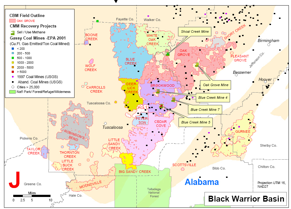 Specific emissions (annual gas emitted / coal produced) of the EPA’s 121 gassiest active coal mines were calculated and mapped. The greatest number of gassy coal mines is located in the Appalachian basin, while the Black Warrior Basin has the highest mean specific emissions.