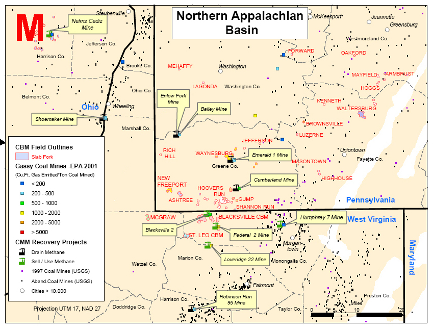 EPA’s Coalmine Emission Outreach Program (CMOP), since 1994, has tracked the “gassiest” active underground coal mines to promote CMM recovery—and for profit and greenhouse gas reduction. Methane = 21 X potency of CO2 as greenhouse gas. By 2001 EPA had gathered emission data for 121 gassy mines, measured by MSHA four times per year. There is a link by MSHA-ID to: Mine location shapefile File with tons coal mined/year CMOP has calculated specific emissions and has plotted graphically and mapped these attributes (Figures 11, 12, and 13).