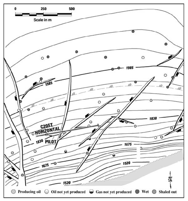 Figure 13. L10 structure map, South Pass 62 field. Well C20st traversed three fault blocks along a 316-m lateral strike to structural dip. Depths are in feet.