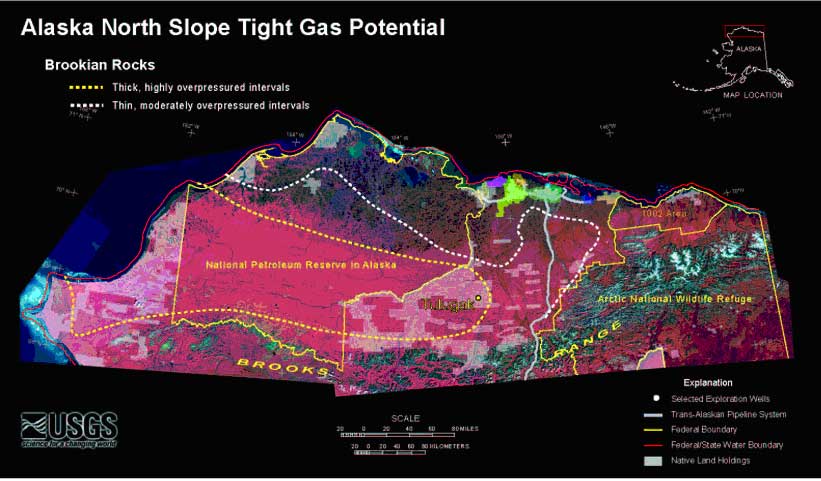 Figure 1. Map of northern Alaska, showing areas in which well data suggest the existence of moderate so strong overpressure in Brookian megasequence rocks.