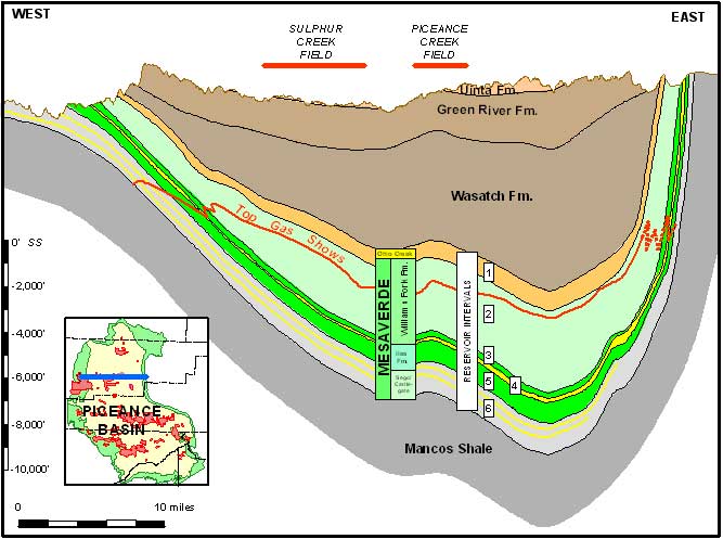 Figure 3. East-west cross-section through the northern Piceance Basin showing the six major reservoir intervals and mapped top of gas.