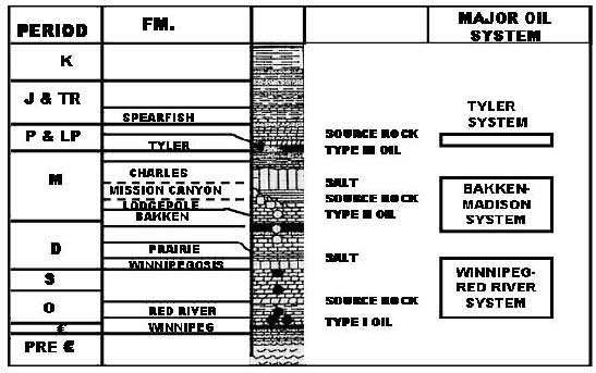 Figure 2. Schematic columnar section showing stratigraphic terminology. Vertical distribution of source rocks, reservoirs, and evaportie Seals in three Williston Basin petroleum systems. Modified from Dow, W.G., AAPG Bulletin, 1974, v.58, p. 1255.