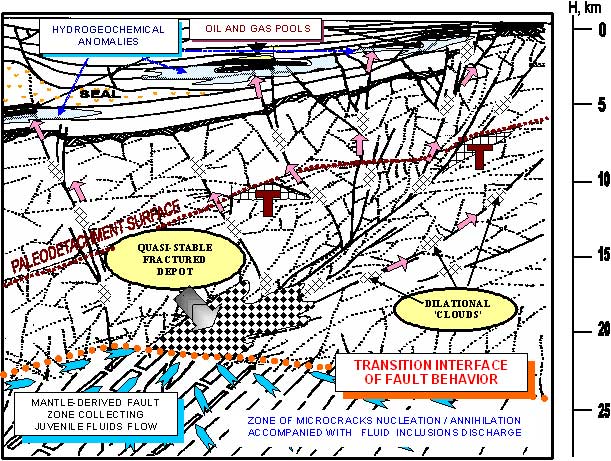 Figure 2. Model of juvenile fluids tectonic pumping and ascending migration of petroleum. (T- temporal fluid depots, arrows – migration of fluids along fractured channelways).