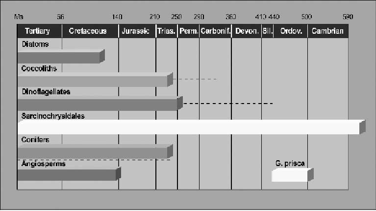 Figure 1. Fossil records of certain organisms suggest age-restricted biomarker concept. Age-related biomarker in oils has been developed using high resolution GC-MS-MS types of analyses, which are effective for differentiation of parts of the Phanerozoic source rock system and their depositional environments.