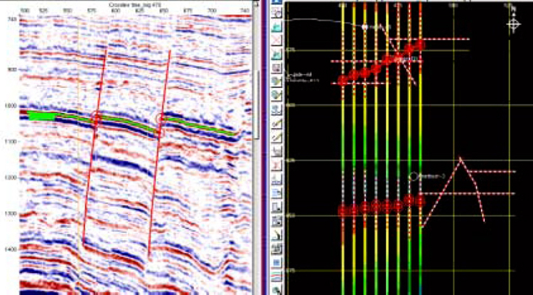 Figure 5. This shows our traditional interpretation workflow where faults are really just used to extract the fault contacts (red circles on left image) that are using in conjunction with the horizon interpretation. Once the fault polygon is constructed on the horizon, the fault sticks are usually discarded.