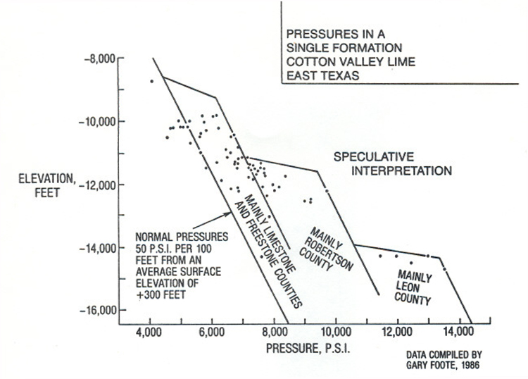 Figure 15-31. Pressure/elevation profiles, from pressures in the Cotton Valley Lime, East Texas.