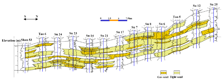 Cross-section of Sulige Gas Field from well Shan 53 to well Su 25.