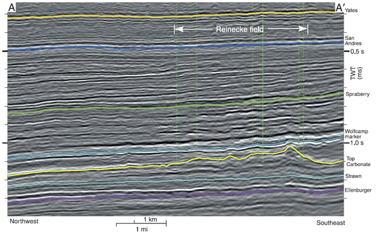 Figure 4. Arbitrary 3-D seismic line showing the Paleozoic section in and around Reinecke field. Note the lack of structural deformation. Selected formation tops are shown. Middle Pennsylvanian (Strawn Formation/Desmoinesian Stage), upper Pennsylvanian (Canyon Formation/Missourian Stage and Cisco Formation/Virgilian Stage), and lowest Wolfcampian (Lower Permian) shallow-marine carbonates started accumulating over a relatively flat surface. Basinal shales and carbonates of Wolfcampian age overlie the irregular upper surface of the reservoir carbonate. The Sprayberry includes basinal sand, silt, and carbonate of Leonardian age. The San Andres shelf margin prograded from east to west (right to left) across the area. The top San Andres is early Guadalupian. The Yates is late Guadalupian in age and is a shelf-interior equivalent to the middle Capitan reef. See Figure 3 for location of seismic line. TWT = two-way traveltime.