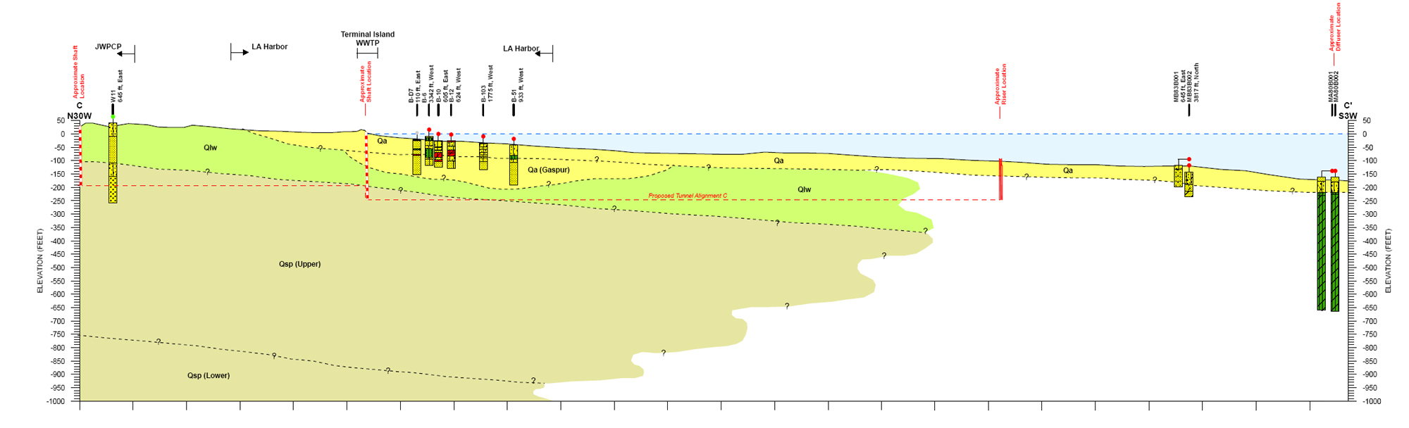 This section shows the generally flat-lying stratigraphy east of the Palos Verdes fault zone. However, the relationship between the onshore and nearshore dominantly granular materials and the cohesive materials at the Beta oil field are poorly understood.