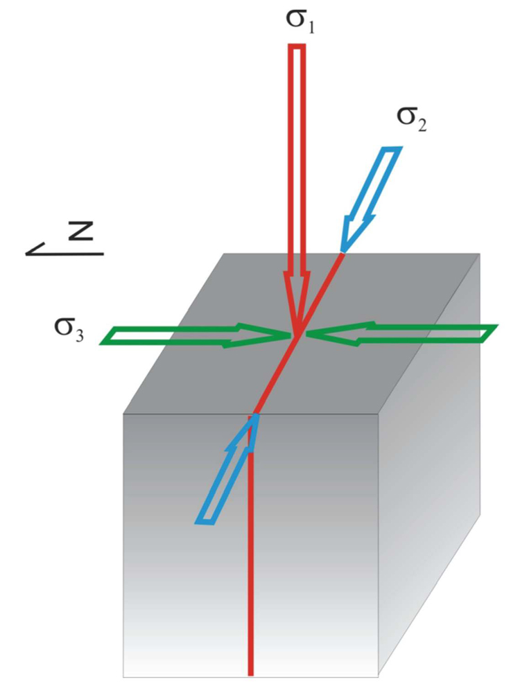 Figure 3-1. This simplified model of a typical Woodford fracture was developed from well data and outcrop observations. The red line represents a S90E-striking fracture with a near vertical dip component. The maximum horizontal stress, s2, was determined from the orientation of drilling-induced fractures. The minimum stress component, s3, is based on borehole breakout data.