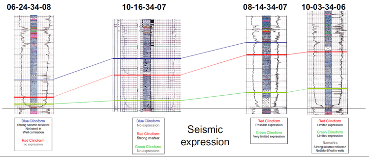 Figure 14. Various clinoform surfaces against logs and cutting descriptions.