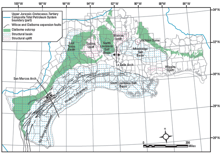 Figure 3. Map of study area (onshore U.S. Gulf Coast) showing Claiborne Group outcrop, Wilcox and Claiborne expansion faults, and outline of major structural features. Claiborne Group outcrop from Schruben et al. (1994); major structural features and faults from Ewing and Lopez (1991).