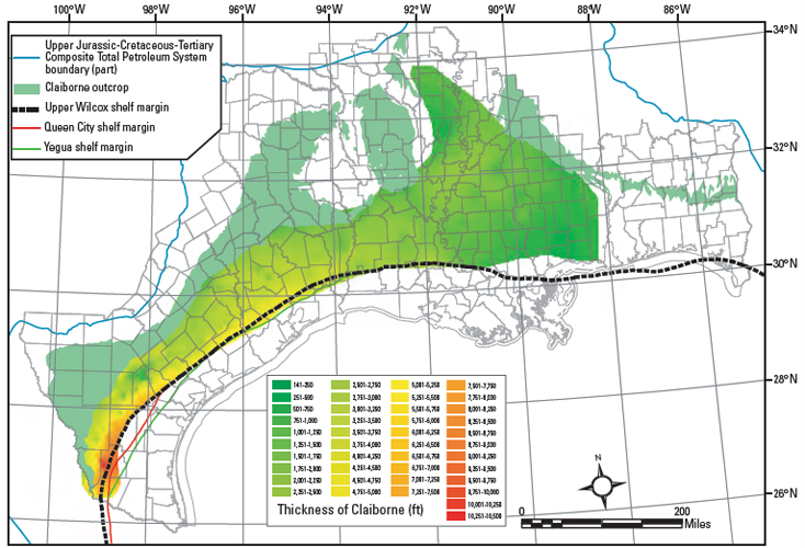 Figure 4. Claiborne isopach map constructed from the IHS Energy Group (2005) database, and from the Paleo-Data, Inc. (1989) Tenroc Regional Geologic database. Tops data were combined with paleontologic data in ArcMap 9.1 (Environmental Systems Research Institute, Inc), and a kriging process step was used to create a surface grid for formation tops. Isopach thicknesses were determined by subtraction of surface grids or by the subtraction of individual data points where sufficient tops data were present in the databases. There are no tops data available from the longitude of Mobile Bay eastward.