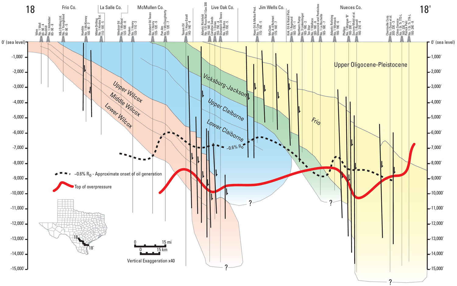 Figure 9. Dodge and Posey (1981) cross section 18 in the Rio Grande Embayment. See Figure 8 caption for additional explanation.