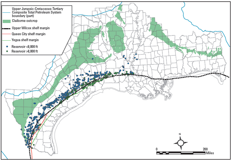 Figure 25. Spatial distribution of Claiborne reservoirs <8,000 ft depth-to-top and >8,000 ft depth-to-top. Note that latitude and longitude are not shown and that the locations of the reservoirs have been shifted slightly to alter their exact location due to proprietary license restrictions on the NRG Associates (2006) database. Claiborne Group outcrop from Schruben et al. (1994); Wilcox and Claiborne shelf margins from Galloway et al. (2000).