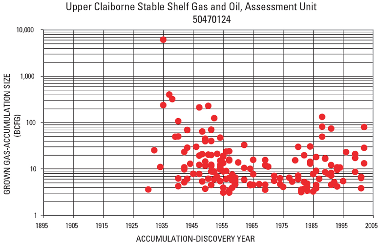 Figure 26. Gas accumulation sizes for the Upper Claiborne Stable Shelf Gas and Oil AU (50470124) plotted as a function of discovery year. Data from NRG Associates (2006), plotted by T. Klett, USGS.