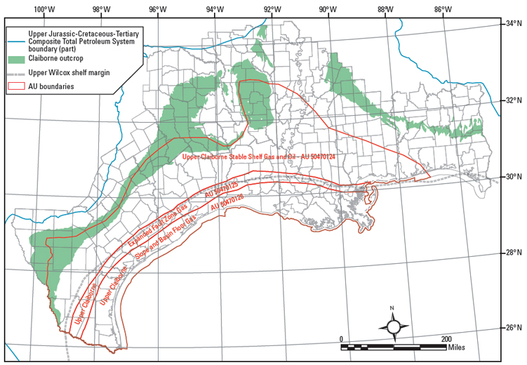 Figure 29. Map showing extent of Upper Claiborne assessment units. AU = assessment unit. Claiborne Group outcrop from Schruben et al. (1994); Wilcox shelf margin from Galloway et al. (2000).