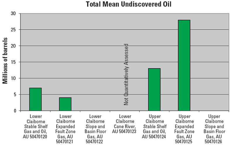 Figure 30. Total mean undiscovered technically recoverable oil in millions of barrels for the seven Claiborne Group assessment units.
