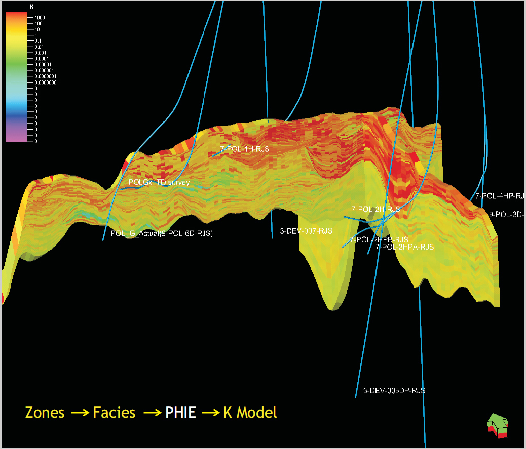 Figure 2-7. K model. Porosity to permeability transforms are specific to carbonate texture types after Lucia (2007).