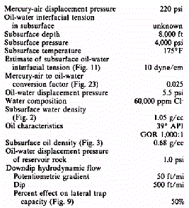 In determining the displacement or breakthrough pressure for a given hydrocarbon-water-rock system in the subsurface, the hydrocarbon-water-rock system in the subsurface, the hydrocarbon-water-interfacial tension, wettability, and radius of the largest connected pore throats must be measured or estimated. The range of these variables and methods of estimating subsurface values for these variables will be discussed.
