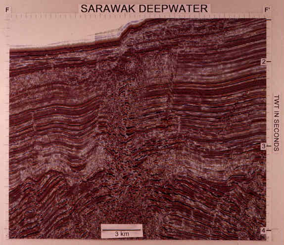 Fig. 11 - Seismic section (F-F') in northern Sarawak Province (Sarawak deepwater), Sarawak basin. Line of section in Fig. 7.
