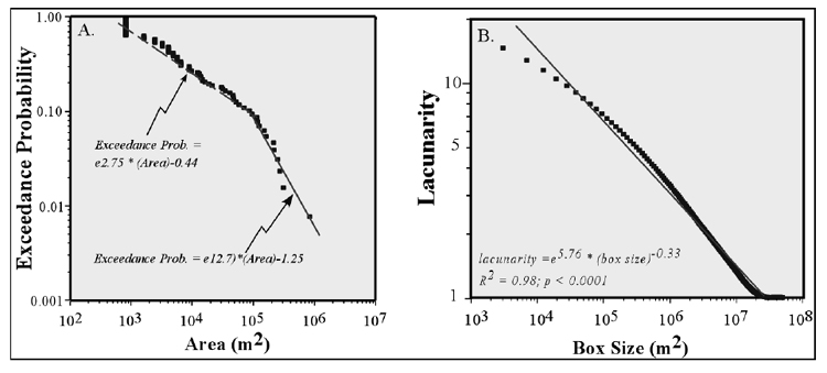Figure 2. Attributes of size and spatial distribution for the levee-beach ridge habitat: tidal flats, Andros Island. A. Area-Exceedance probability (E.P.), both on log scales. E.P. is equal to the ranking in size, from largest to smallest, divided by the (number of samples + 1), and it represents the cumulative probability P[X>=x] that a given patch of area X has an area larger than x. B. Lacunarity-Box size, both on log scales. Lacunarity describes gap size distribution between patches of the same habitat, for a range of box sizes. Both have general power-law scaling relationships (lines).