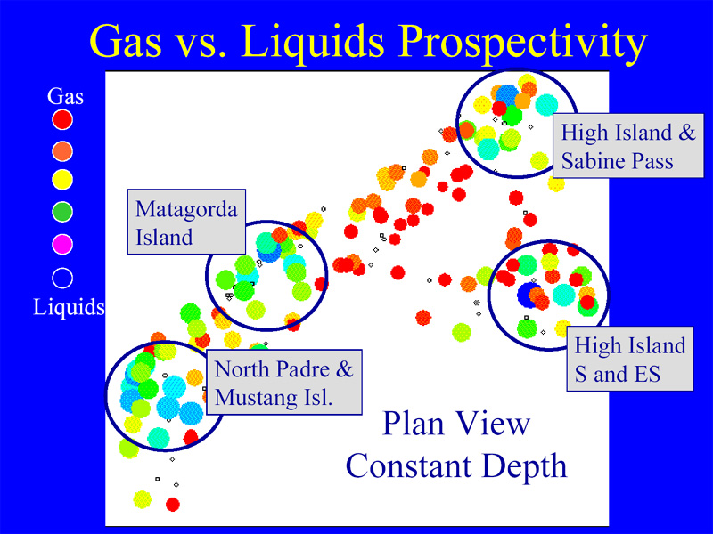 Figure 12. Gas vs. liquids prospectivity, at constant depth, in the Texas Gulf Coast and offshore.