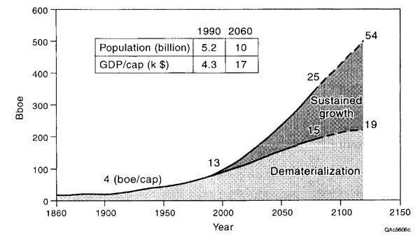 Figure 5: Contrasting scenarios of global energy requirements for the twenty-first century (from Dupont-Roc and Khor, 1994). cap, per capita.