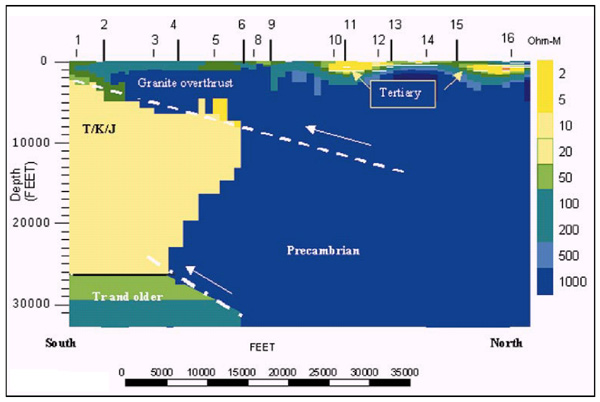 Figure 11 – An inversion of 15 MT stations acquired along a north-trending profile in southern Wyoming. Precambrian granite was thrust from north to south in this MT resistivity section.