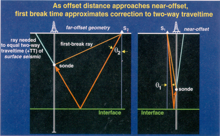 Figure 4. On a zero- or near-offset VSP, the upgoing reflected event travels down to the reflecting interface and up to the sonde containing the geophones. If the raypath had continued to the surface along the additional blue line, the event would be in two-way traveltime. The traveltime along the blue path is the first break time for zero-offset geometry. By adding this time to the trace recorded at the sonde, the VSP data is placed into pseudo two-way traveltime.