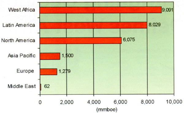 Figure 1. Reserves in global deepwater fields, arranged according to region, identified for development in 2000-2005 (from The Offshore West Africa Report 2000-2005: Douglas-Westwood/Infield Systems).