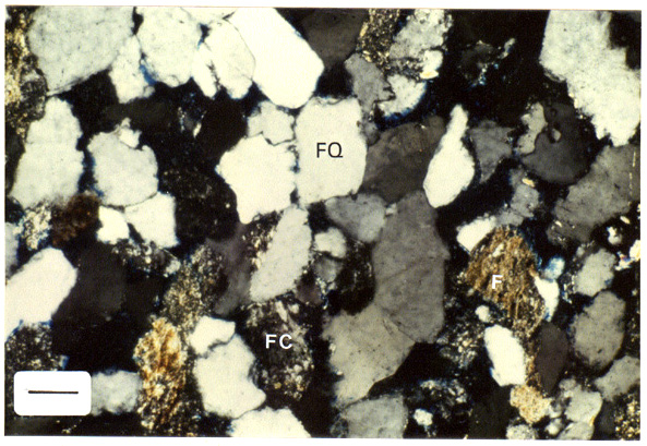 Figure 18 --Closely packed framework grains of quartz (FQ), chert (FC), and highly altered feldspar (F) that led to sutured grain boundaries. Duyong 6H-32.1 , 2219.8 m msl. Crossed nicols. Scale = 0.10 mm.