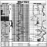 The lowermost sandstone interval (5998-6010 ft) ranges from medium- to coarse-grained and poorly to moderately sorted. This interval is extremely friable and has abundant framboidal pyrite cement from 5998 to 6006 ft. Crossbedding is evident from 6007 to 6010 ft. The corresponding log response (5990-6002 ft) shows misleading low resistivities, high gamma-ray and neutron readings owing primarily to the abundance of diagenetic illite, pyrite, and phosphate.