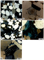 Illitic detrital matrix with microporosity. (E). Microcline in a quartzose
