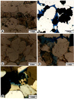 calcite cement filling pore spaces. (E).