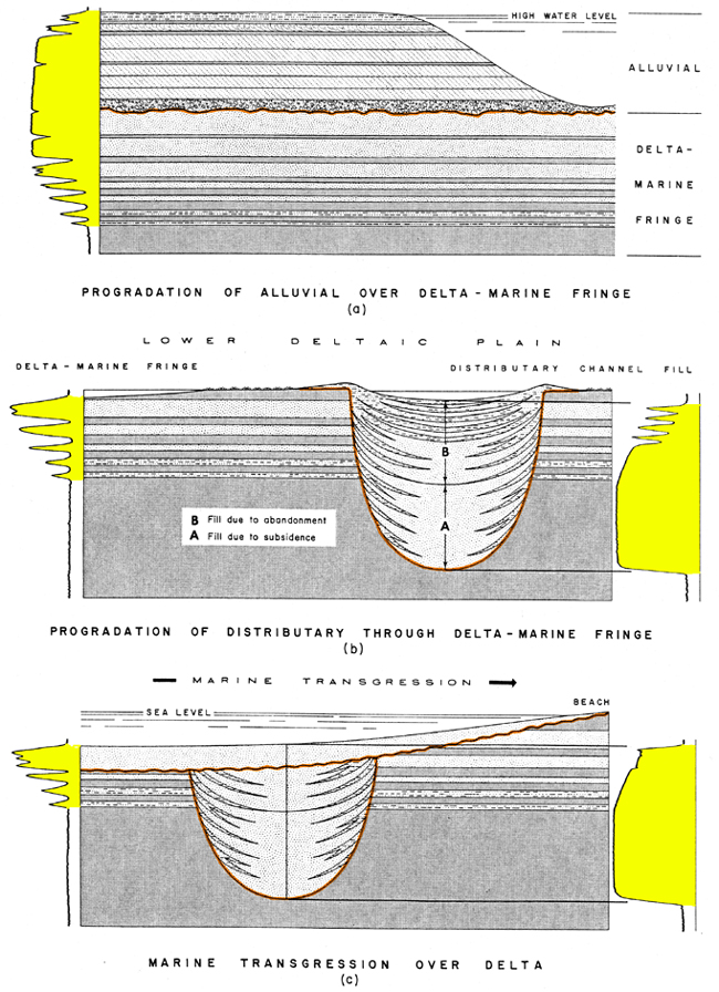 Figure 11 - Hybrid Sand Units; Idealized Examples of Progradation of Alluvial over Delta-Marine Fringe, Progradation of Distributary through Delta-Marine Fringe, Marine Transgression over Delta
